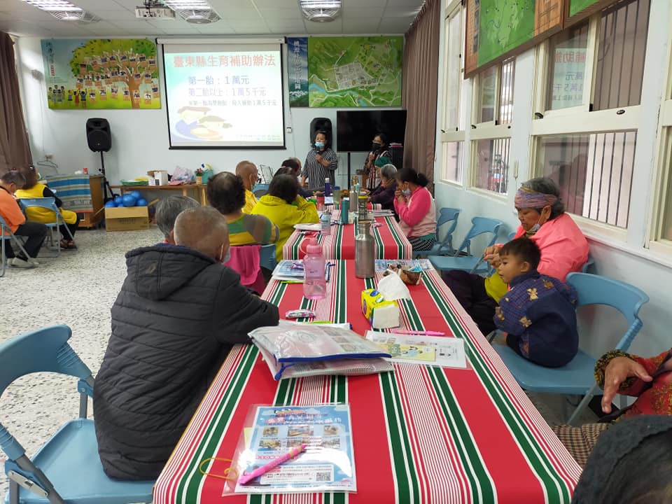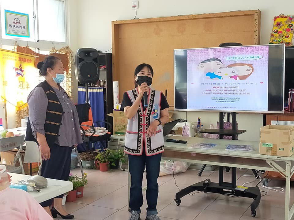 業務宣導過程中現場請族語老師AIi使用親切的布農語口譯翻譯協助宣導:縣府拿~魔~好免費育兒指導服務政策;