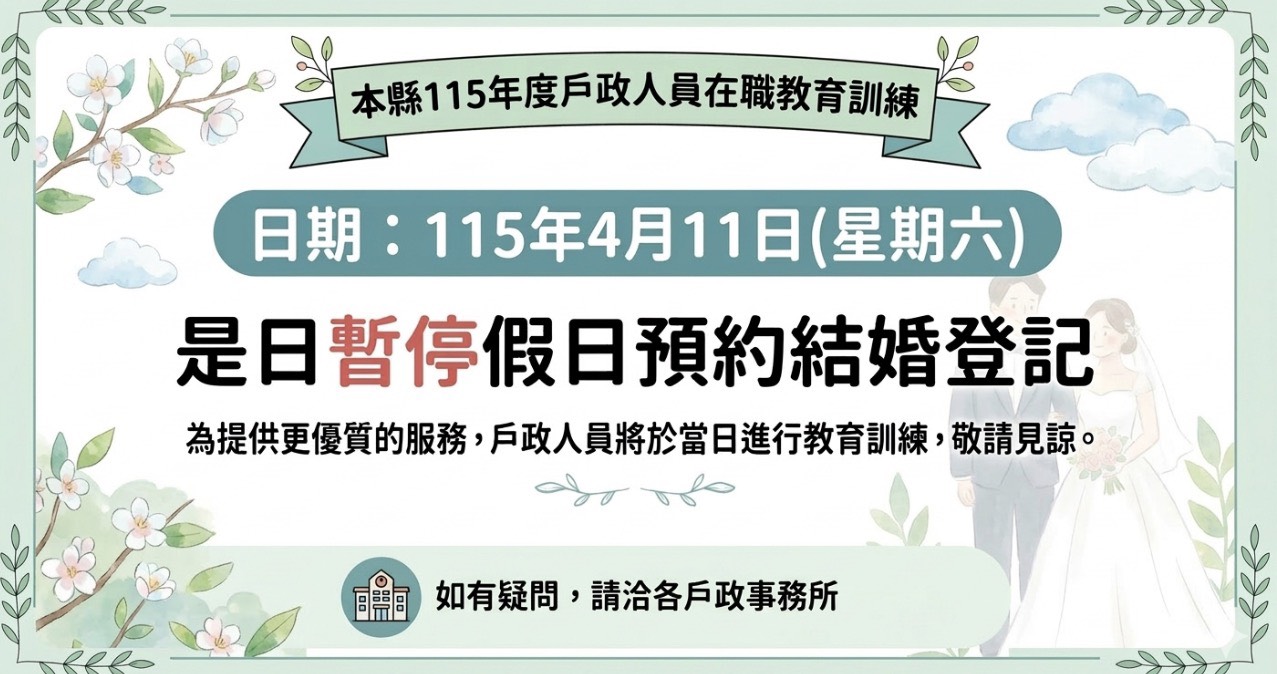 有關本縣115年度戶政人員在職教育訓練,訂於115年4月11日(星期六)舉行,是日暫停假日預約結婚登記。