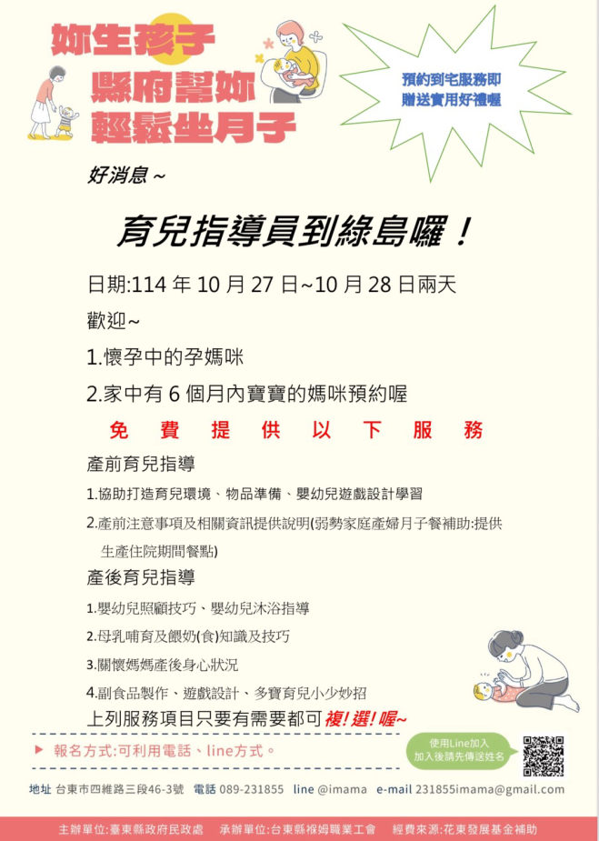 「妳生孩子 縣府幫妳輕鬆做月子」好消息~育兒指導員到綠島嚕!