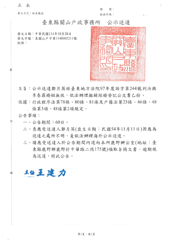 鄭月英經臺東地方法院97年度訴字第244號判決與李春霖婚無效特此公示送達