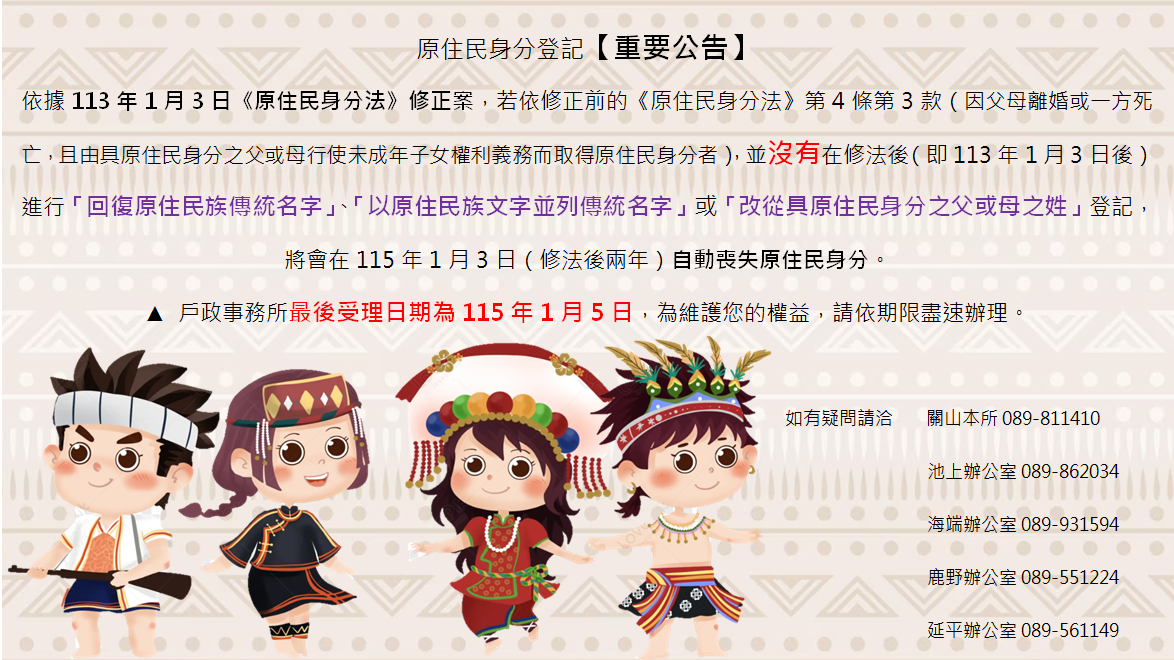 依修正前《原住民身分法》取得者注意!請務必於 115年1月5日前完成從姓/取名登記,逾期將喪失原住民身分及相關權益!